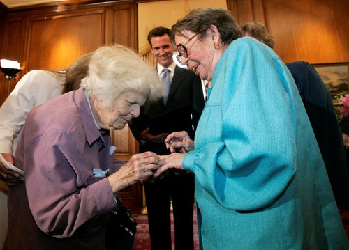 Martin and Lyon were the first couple in line to be “remarried” in San Francisco earlier this year when the California Supreme Court declared marriage for same-sex couples a fundamental right. The couple had become lead plaintiffs in the case after their first marriage, along with thousands of others recognized legally by Mayor Gavin Newsom, was nullified by a lower court.