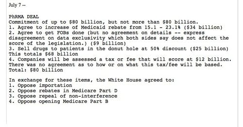 In exchange, the Pharmaceutical Researchers and Manufacturers Association (PhRMA) agreed to cut $80 billion in projected costs to taxpayers and senior citizens over ten years. Or, as the memo says: “Commitment of up to $80 billion, but not more than $80 billion.”