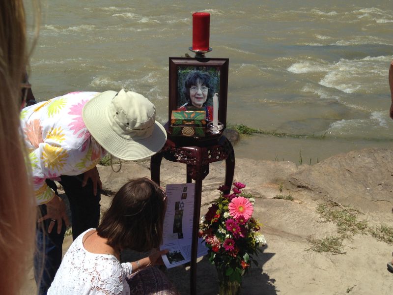 There were over 30 of us who walked to the rocks on the banks of the river where a small table had been carried. Women and men from the CFO were in bright pink t-shirts and shared the grief of many of us from Austin who had treasured Judith for her honesty, her humor, and her tireless work to bring some justice to the border. Assembled on the table were a large vase of flowers, candles, a photo of Judith in one of her many huipils, and the small box that held Judith’s ashes.