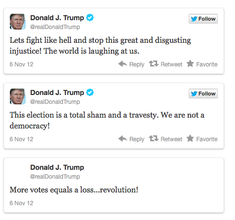 It was difficult not to chuckle at a tweet let fly by The Donald Trump calling the election a sham and advocating, I kid you not, “revolution!”