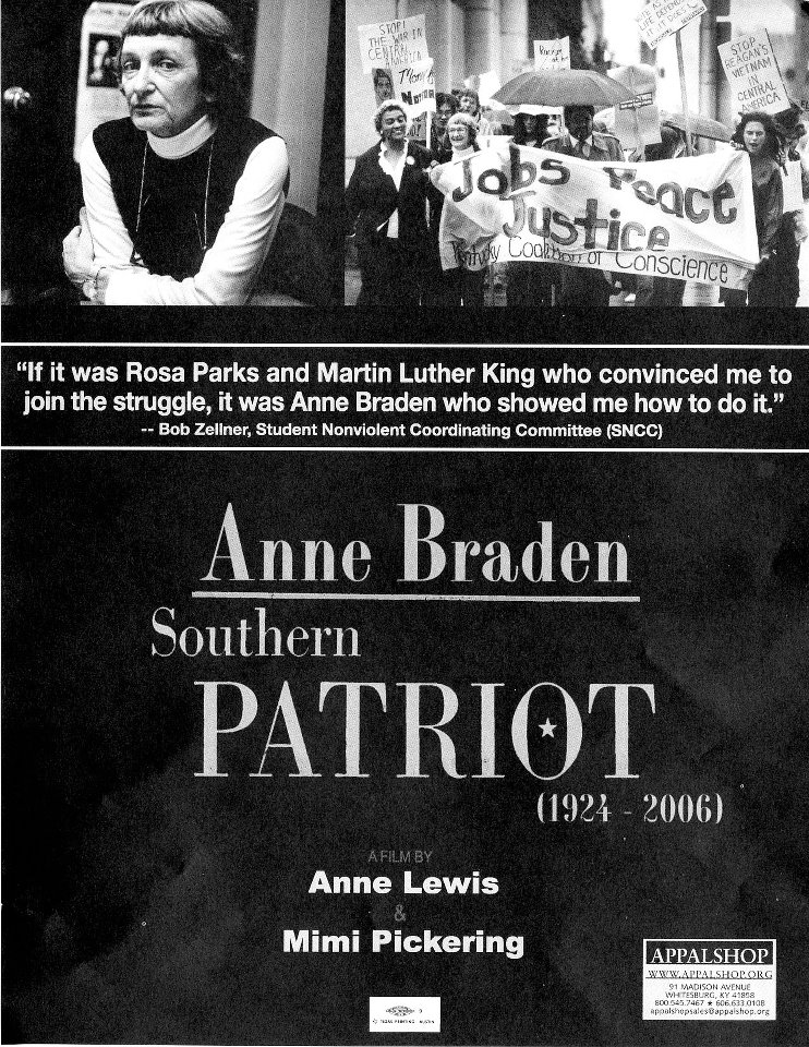 Anne Braden: Southern Patriot, a documentary by Anne Lewis and Mimi Pickering, will screen at the Alamo Drafthouse South, 1120 S. Lamar, Austin, Texas at 7 p.m., Wednesday, July 18. Don’t miss it.