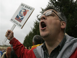At both stops, there were cries of, “Nobama,” picking up on a phrase that has appeared on yard signs, T-shirts and bumper stickers.