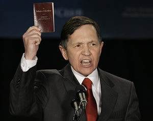 Fightin’ words: Rep. Dennis Kucinich brandishes his pocket Constitution on the campaign trail in New Hampshire last January. Photo by Stephan Savoia / AP