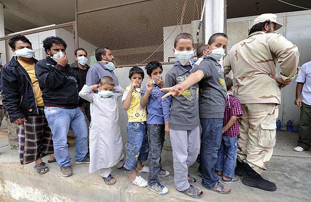 Libyan men and children queue up to view the corpse of Muammar Qaddafi. Photo from Getty Images.