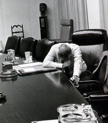 At some point, LBJ realized what he had done. His extant image is not of a victorious, canonized Lincoln or FDR, but of the exhausted shell of an on-his-way-out president, slumped over a table, listening to a tape from his son-in-law in Vietnam (the photo is by Jack Kightlinger, July 31, 1968).