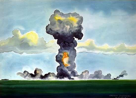Art from 1946 atmospheric nuclear weapons tests at Bikini Atoll. “Plus 3 Seconds,” watercolor by Grant Powers, 1946 / Naval Historical Center.
