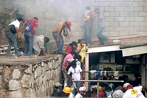 Beginning early Monday, helicopters circled over the embassy and police surrounded the zelayistas but matters became more serious later when the de facto government announced a curfew throughout the country from 4:00 that afternoon until 7:00 the next morning. Some left and some stayed, vowing to spend the night outside the embassy. Around 4:00 Tuesday morning, with around 500 demonstrators still at the embassy, the police moved in with tear gas, water cannons, rubber bullets, pepper spray and, according to some, live ammunition. An unknown number were arrested, many were injured.