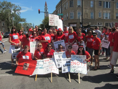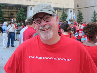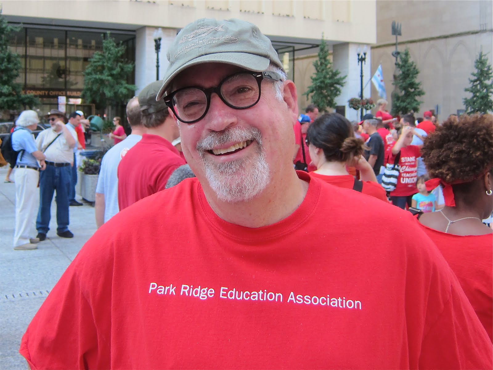 He doesn’t go into the classroom to teach kids anymore, but he hasn’t retired from political activism and from protesting 101. A long-time president of his local union, he’s as politically active now as he’s ever been. With Chicago teachers on strike, he’s out in the streets with tens of thousands of other teachers and like them wears a red shirt. He also writes about the strike almost daily on his blog, FredKlonsky.com.