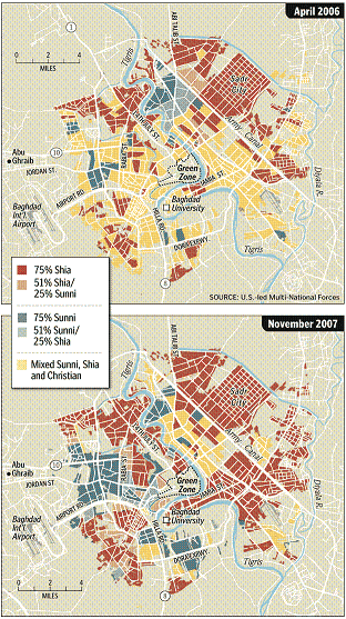 ‘ The sectarian cleansing of Baghdad has been — albeit tragic — one of the key elements to the drop in sectarian violence in the capital. […] It’s a very simple concept: Baghdad has been divided; segregated into Sunni and Shia enclaves. The days of mixed neighborhoods are gone. […] If anyone is telling you that the cleansing of Baghdad has not contributed to the fall in violence, then they either simply do not understand Baghdad or they are lying to you.’