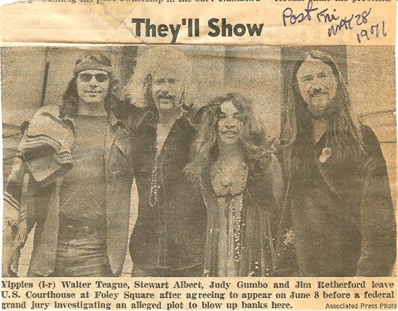 I was one of seven activists commanded to testify in New York. Our response was quite appropriate. Stew Albert, a large man with a big blonde afro, wore a custom-made rainbow-sequined dress with appliqué spelling out the name “Bernardine” (for Bernardine Dohrn, the Weather Underground spokeswoman who had announced the group’s responsibility for the Capitol bombing and a number of other equally provocative “armed” actions). Judy “Gumbo” Clavet and Santa Barbara-Isla Vista activist Sandra Wardwell dressed as witches and carried broomsticks… to assist Goodwin in his witch hunt.