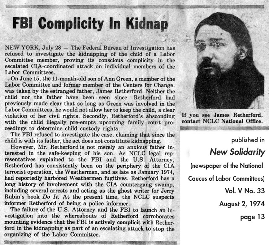 At that time, I was “underground” myself, having moved my infant son to safety far away from the Newman cult in whose hands Jesse had been criminally neglected, abused, and almost killed. The group was under investigation for child endangerment. This was the period when NCLC was staging violent attacks on public meetings held by the Communist Party USA and the Socialist Workers Party, when Chairman LaRouche appeared to be mentally unstable and a number of suspected agents (including Zeke Boyd, who had been thrown out of the Baltimore Black Panther chapter as an agent provocateur) had moved into secondary leadership positions and were orchestrating the group’s orgy of thuggery and intimidation. Many New York activists already had concluded that NCLC had, by this time, become a front for the government’s attack on the anti-racism/anti-imperialism movement.