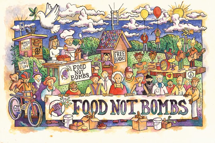 FNB’s website tells us that “Food Not Bombs shares free vegan and vegetarian meals with the hungry in over 1,000 cities around the world to protest war, poverty and the destruction of the environment.” Then it asks, “With over a billion people going hungry each day how can we spend another dollar on war?”