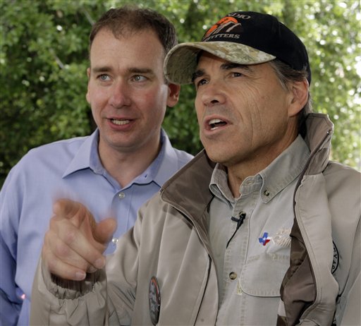 Texas’ Panderer-in-Chief, Gov. Rick Perry, covers his lovely locks with a gimme cap at the Texas tea party rally April 15, 2009 at the state capitol. With him is Michael Quinn Sullivan of Texans for Fiscal responsibility. Photo by Harry Cabluck / AP.