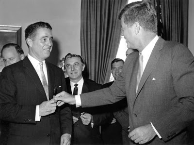 President John F. Kennedy with brother-in-law, Sargent Shriver, then director of the Peace Corps, after signing a bill giving the Peace Corps permanent status, Sept. 22, 1961. Photo from UPI.
