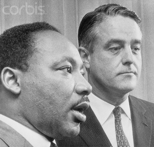 Sargent Shriver, then director of the Office of Economic Opportunity, shown with Dr. Martin Luther King, Oct. 24, 1966. Photo from Bettman / Corbis.