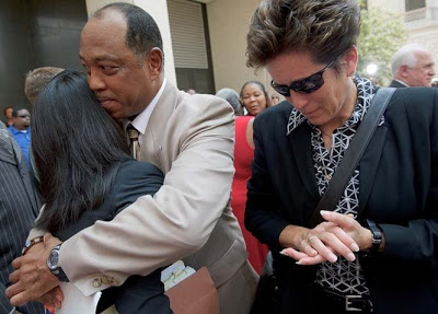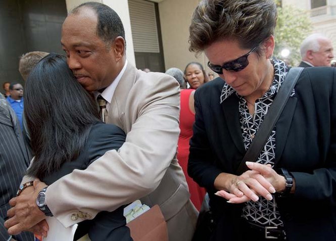 Lance Madison, left, whose brother, Ronald, was shot and killed on the Danziger bridge by New Orleans Police Sept. 5, 2005, gets a hug from prosecutor Cindy Chung outside the Federal Court building Friday. Lead prosecutor Barbara “Bobbi” Bernstein is on the right. Photo by Matthew Hinton / The Times-Picayune.