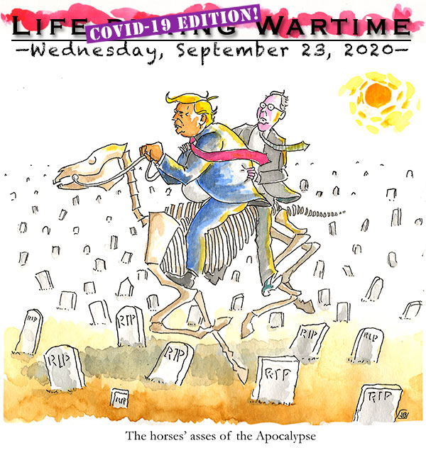 I have no artistic skill. I marvel at the way this artist portrays Trump and McConnell. Trump, with his hair, must be fairly easy. But with just a few strokes of his pen, Joshua Brown drew a man that is obviously McConnell. This is dark humor for sure — so much death and suffering that could have been avoided. Two evil men out to destroy American democracy. The idea that Trump might continue as president is frightening to me and just about all of my friends and family.