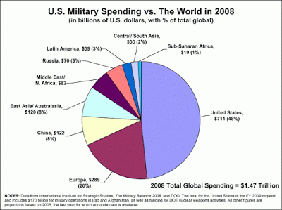 The real military-related expenditures of the U.S. are closer to $1 trillion. If the US cut those back to the level of the European Union and spent the money on promoting solar energy and making it inexpensive, America would have a chance of remaining a great power in the 21st century. If it goes on rampaging around the world bankrupting itself by invading and occupying other countries, the Chinese will laugh at us all the way to world dominance.