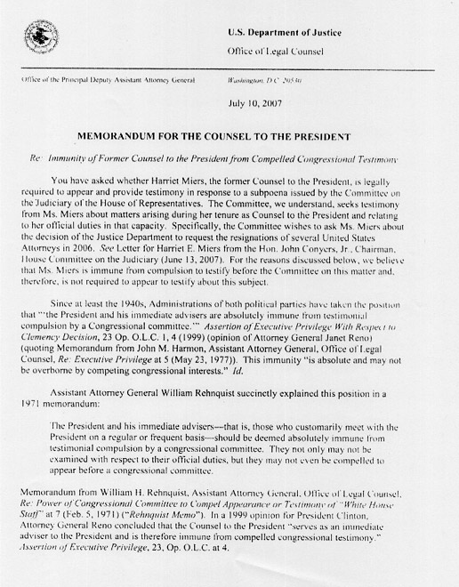 Ms. Miers and Mr. Bolten, citing legal advice from the White House, have refused for months to comply with Congressional subpoenas. The White House has repeatedly invoked executive privilege, the doctrine that allows the advice that a president gets from his close advisers to remain confidential.