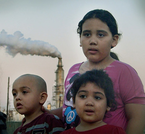 | Children from the Manchester neighborhood in Houston with oil refinery smokestack in the background. Photo by Tar Sands Blockade. Photo by Tar Sands Blockade / YES! Magazine. |
