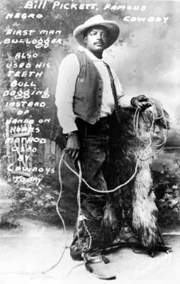 (Pickett’s bulldogging creation came about by accident when a bull got loose in downtown Taylor, menacing shoppers and those doing business on Main Street. Pickett chased down the animal, grabbed it by the horns and twisted its neck, using what became his signature move in later bulldogging competitions — he bit the animal on its lip to bring it down.)