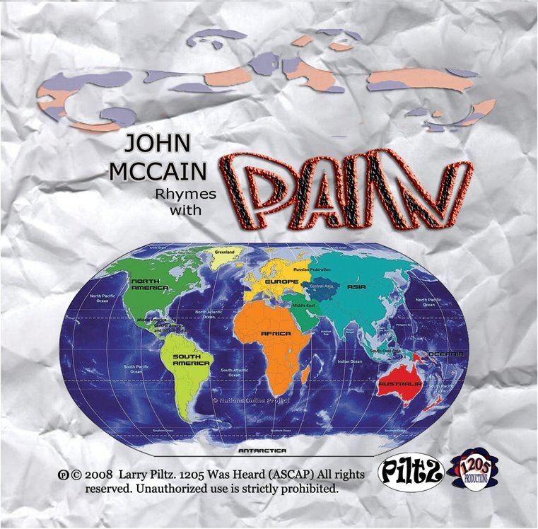 We are overjoyed to present, once again, with feeling and, more important, with sound and graphics, Larry Piltz’s poetic ode to the Republican Presidential candidate, John McCain Rhymes with Pain. We hope you enjoy this astounding tribute to what we all should want to avoid in November.
