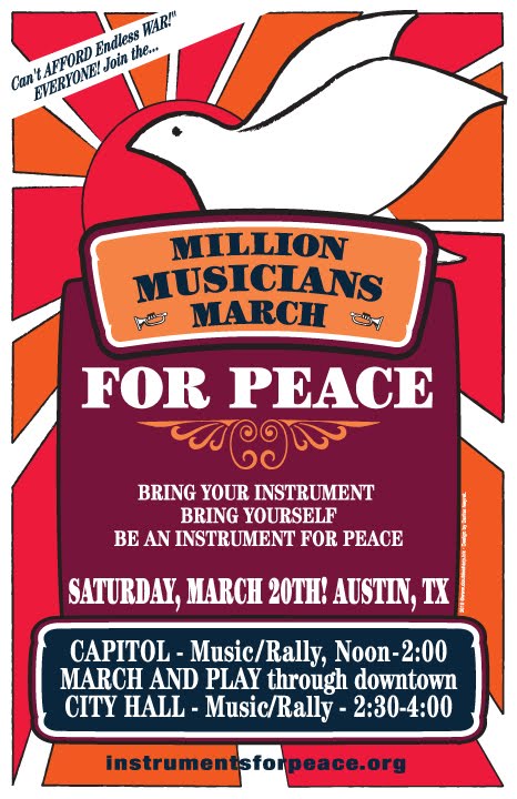 Million Musicians March for Peace in Austin, Texas, Saturday, March 20, 2010. Music/Rally at the Capitol, 12 Noon. Parade from Capitol through downtown Austin, 2 p.m. Music/Rally at Austin City Hall, 2:30-4 p.m. Be an Instrument for Peace.