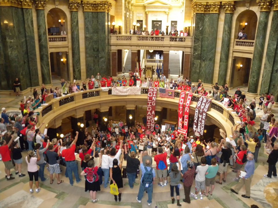 Solidarity singers continue to gather at the Capitol in numbers ranging from 20-30 to more than 200. Barring officially scheduled events, they circle the Rotunda floor, with their conductor strategically placed before the bust of Robert M. La Follette, the state’s most beloved opposition politician.