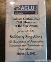 On March 17, 2012, the American Civil Liberties Union of Wisconsin presented Reeder, on behalf of the Solidarity Sing Along, a much deserved award, the William Gorham Rice Civil Libertarian of the Year Award “for the expression of the First Amendment rights of free speech and freedom of assembly.” Even more recently, Leadership Wisconsin, a group that promotes the development of leaders to strengthen communities, tagged Reeder for yet futher recognition.