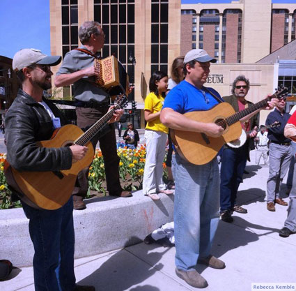 The selection of songs varies from day to day, but every sing-along concludes with the group’s theme song, “Solidarity Forever.” A timely favorite is “Roll Out the Roll Call,” with new lyrics by Sheboyganites Frank and Mary Koczan. “Recall Scott Walker…/Give him a kick in the rear!/ Recall Scott Walker…./Toss him right out on his ear!” If the chorus of Ralph Chaplin’s labor classic routinely produces raised fists, the updated “Beer Barrel Polka” invariably stirs a few in the crowd to polka, German-style. This is Wisconsin, after all.