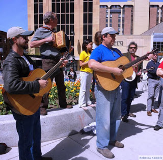 On other days they brave the cold winds, rain, and snow of the Wisconsin winter and, in recent weeks, revel in the unusually warm temperatures. For the outdoor gatherings (Walker banned all instruments from the Capitol), musicians bring an assortment of instruments — violins, guitars, mandolins, sousaphones, and squeeze boxes — and play together as “The Learning Curve” pick-up band.