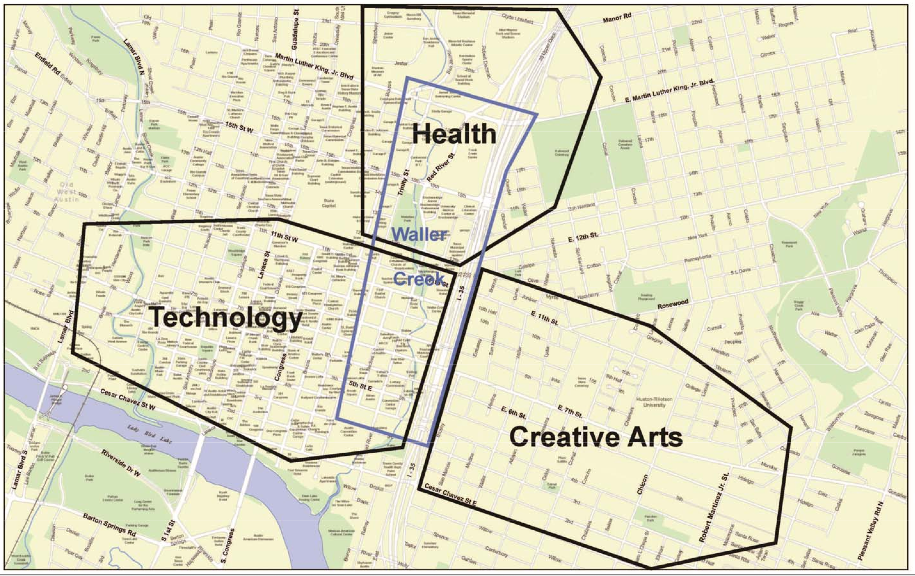 The Downtown Austin Alliance has mapped out three central Austin future development districts for Technology, Medical, and Creative Arts in the May 15 Austin Innovation Zone study. The medical district is a tall north south rectangle bounded by MLK on the north, Trinity on the west, IH-35 on the east, and 3rd street on the south (Graphic D). See page 19 for the districts map. Page 22, titled “Whats Missing?” points out that the Project Connect light rail line is a missing element that the developers will need.