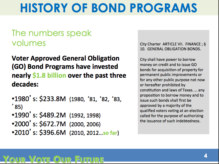 This maximum level of new debt ties the hands of future city councils and threatens our current AAA bond rating, according to the Austin Financial Services Department. The video to watch is Asst. Austin Financial services Director Greg Canally speaking from 17-32 minutes in this video clip, at the end of which Elaine Hart chimes in and says the Austin debt burden would be quite high with six cents added: Open this clip, then open item D, on General Obligation bonds.