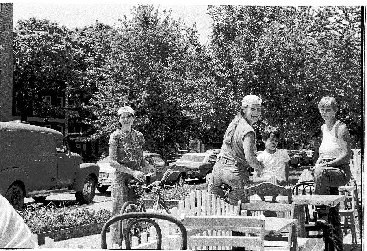 Next to the garden stood our prized functional-sculpture bike rack. One day it was there, the next day gone. A pretty thing — baby blue topped off with a red heart — it was welded together by Gene Balicek. He was an artistically-inclined young fellow who was also the first paint man on the baby blue/maize/maroon sign, designed by artist and friend Lester Dore, that still adorns 60-plus feet of the Heartland building’s parapet wall, and visible to riders of the El as the train pulls in or out of the Morse-Lunt stop.