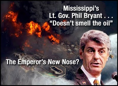 Bryant, who back slapped his way to hosting the National Association of Lieutenant Governors in July in Biloxi went on about the BP disaster noting it is “not the Exxon Valdez.” Phil was as oily and about as crude as his odorless oil out there declaring there is nothing to worry about, “Y’all come on down here, you hear!”