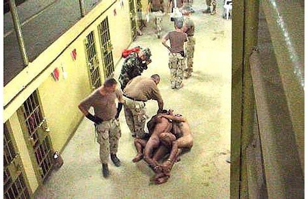 Another apparently shows a female prisoner having her clothing forcibly removed to expose her breasts.