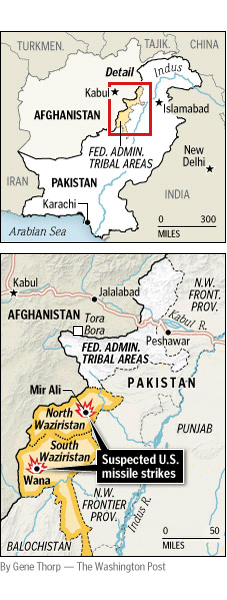 Two remote U.S. missile strikes that killed at least 20 people at suspected terrorist hideouts in northwestern Pakistan yesterday offered the first tangible sign of President Obama’s commitment to sustained military pressure on the terrorist groups there, even though Pakistanis broadly oppose such unilateral U.S. actions.