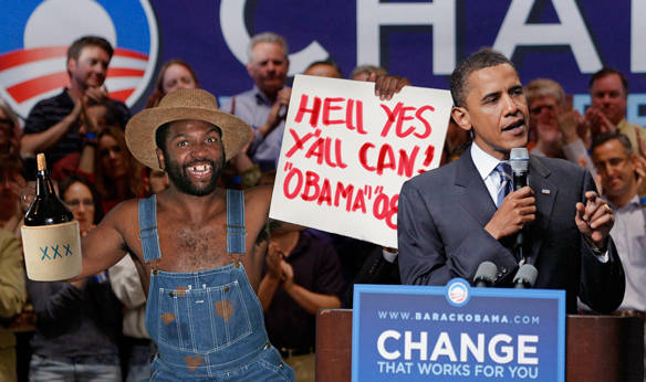 Despite the setbacks he has caused, Cooter has secured a small but devoted following, and has occasionally managed to reflect well on the campaign. At a speaking engagement to which Obama arrived two hours late, Cooter kept the crowd’s spirits up by breaking out a washtub string bass and a washboard and holding an impromptu hoedown.
