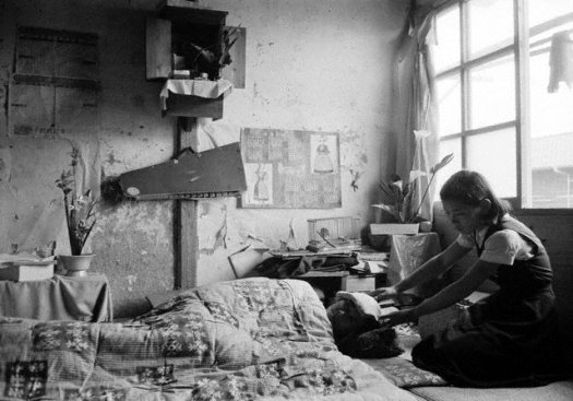 Hiroshima: Ten Years Later. “I’m Just Waiting For Death.” Those are the words of Mrs. Yoskio Nishikawa, 43, bedridden “A-Bomb widow” who lives on $22 a month in charity. Yukiko, 15, one of her four children, cools her forehead with a wet towel as the 70-pound widow rests in their nine-foot square room, part of a frame charity home housing families of 20 widows. A small wooden Shinto shrine, in memory of her blacksmith husband who was killed while riding to work, occupies a place of honor. Mrs. Nishikawa suffers from radiation effects because she combed the city searching for her husband after the bomb fell. She has a bad heart and liver trouble. (1955) Photo: Source.