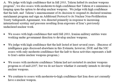 While the document indicates that Iran could be developing the nuclear weapons covertly, then it seems necessary to determine who, what, and where this action is taking place. If the current administration and Obama as the next, are convinced that to keep any information they have about a covert operation secure, they will continue to allow Iran to believe they are watching ‘Iran only’ (as a country). Too much public information on a topic like this, would be negligent as part of a security effort to prepare appropriate action when/if required, by the USA.