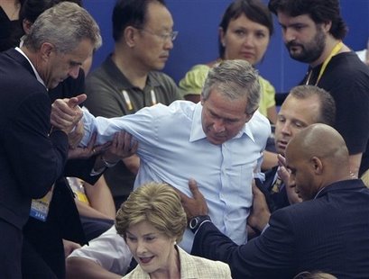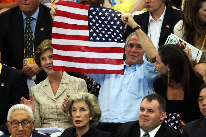 George W. Bush seems happy as ever as America’s cheerleader-in-chief at the Beijing Olympics. Too bad his handlers didn’t take care of the flag business as they normally do in arranging props for the President.