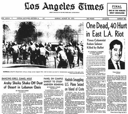 The next day he was dead. On Aug. 29, 1970, while covering the National Chicano Moratorium against the Vietnam War, the 42-year-old Salazar was killed instantly by a sheriff’s tear gas projectile while he sat in an East Los Angeles bar…
