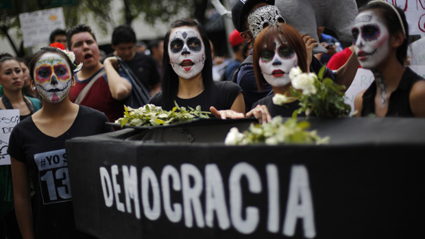 Protesters from Yosoy132 hold a mock funeral for “domocracia” during march in Mexico City, Saturday, July 14. Photo by Bernardo Montoya / Reuters.