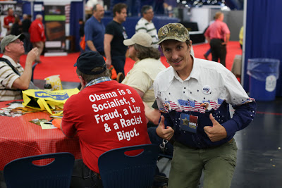 You could not walk more then 20 feet without seeing a shirt daring Obama to come and take their firearms. Shirts that called Obama a fascist and a racist… and signs in the front of the convention center with the President sporting a Hitler mustache.