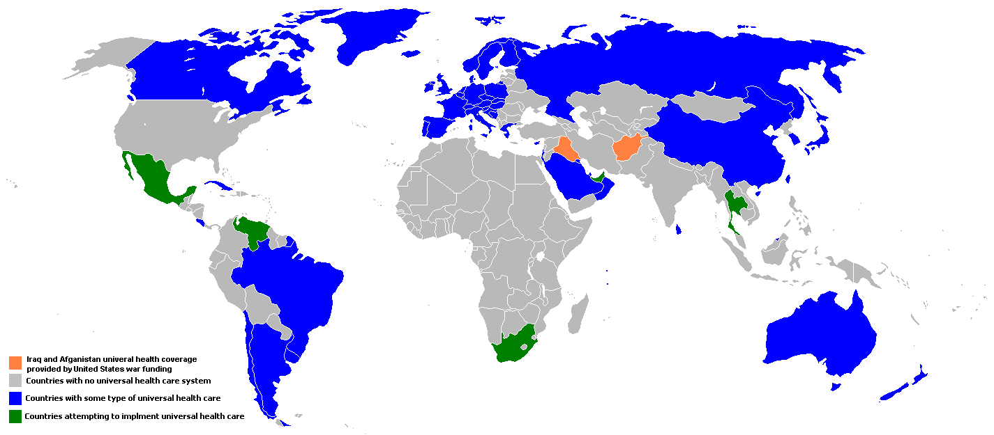 In the map above, the countries with universal health care are in blue. Those trying to get it are in green. Note that the United States proudly takes its place among the third-world countries of Central Asia, Africa, and parts of South America. We should be ashamed.