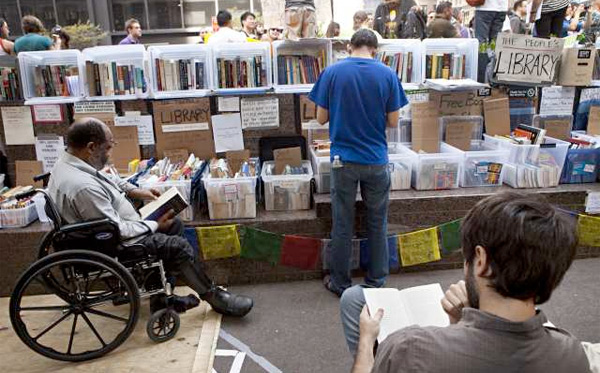 The library, which started out as a box of books and grew to a collection of more than 5,000, was originally out in the open air. Rocker, poet, and National Book Award winner Patti Smith donated a tent to house the library and protect the books from the weather. — Los Angeles Times / November 15, 2011