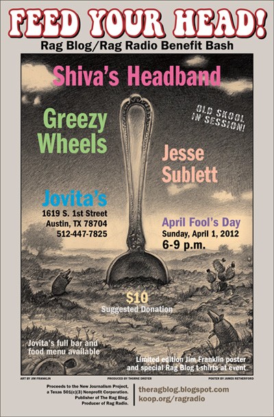 “Old Skool” will be in session on April Fool’s Day at Jovita’s in Austin, when The Rag Blog and Rag Radio invite you to “Feed Your Head.” A big slice of Austin music history will be on display at the event, which will feature performances by Shiva’s Headband, Greezy Wheels, and Jesse Sublett.