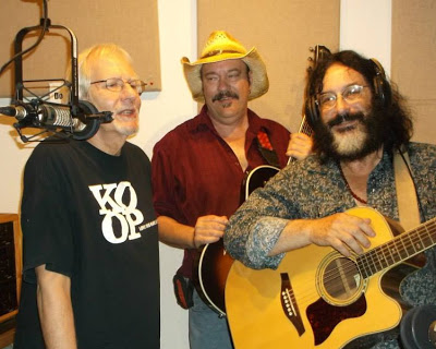 | Rag Radio’s Thorne Dreyer, left, with Billy Bourbon and Guy Schwartz in the studios of KOOP-FM in Austin, Texas, July 5, 2013. Photo by Marlo Blue / The Rag Blog. |