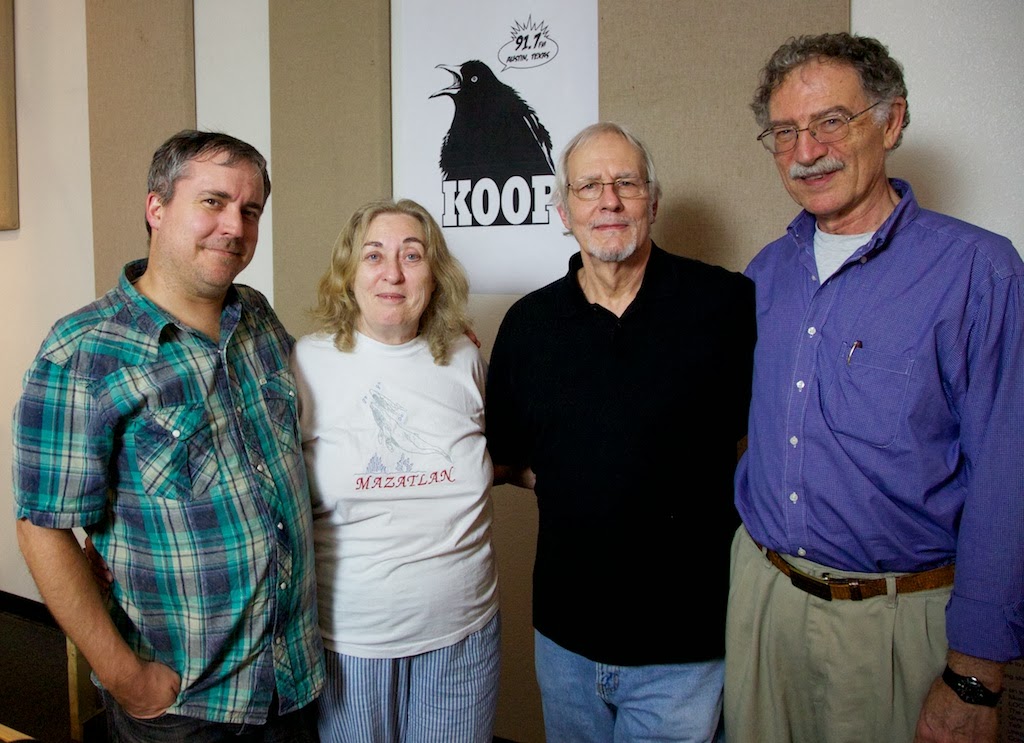 | From left, Rag Radio’s Tracey Schulz, guest Mariann Wizard, host Thorne Dreyer, and guest Doyle Niemann, at the studios of Austin’s KOOP-FM, November 15, 2013. Photo by Alan Pogue / The Rag Blog. |