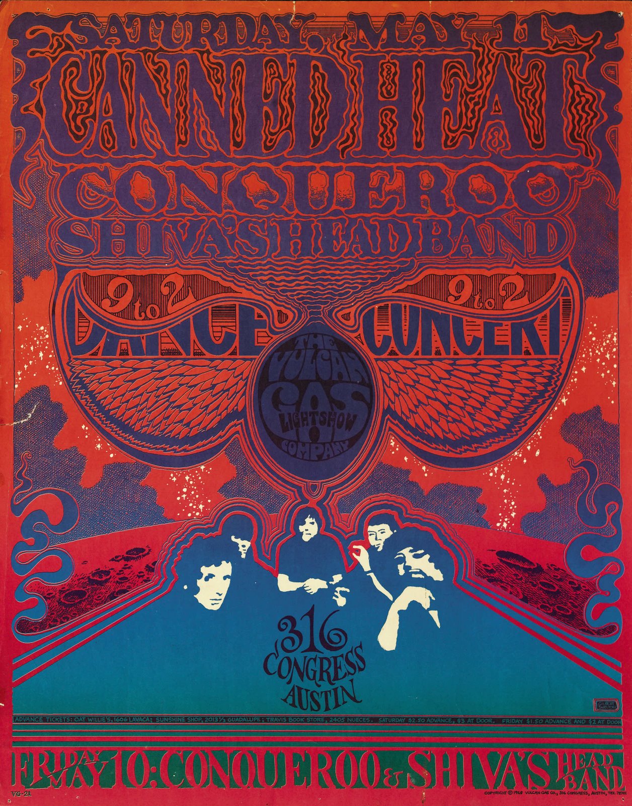 Meanwhile, I heard stories. Gilbert had joined Pat Brown, then a student at the Cleveland Art Institute in Cleveland, where he had tried to work for American Greeting Cards, but it hadn’t taken. Back in Austin, he did psychedelic posters for the Vulcan Gas Company, then he joined the general exodus to the west coast, hoping to do rock posters.